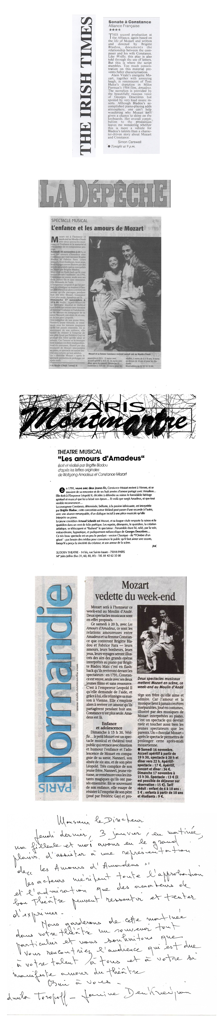 Cette illusion d'assister à de vrais "morceaux de vie" ne provient pas seulement de la mise en scène chaleureuse de Brigitte Bladou mais également du magistral travail de documentation qu'elle a accompli en lisant tous les ouvrages sérieux écrits sur Mozart et en étudiant la correspondance qu'il a échangée avec tous ses proches (au total plus de six cents lettres).